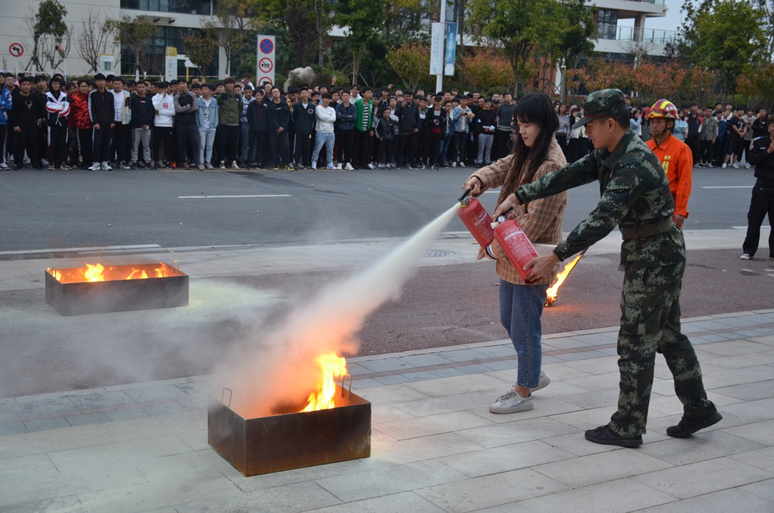 总指挥集合队伍后,张伟中队长向师生讲解疏散要领、自救技能、逃生注意事项以及灭火器的正确使用方法;消防大队和东吴保安部随后布置油盆灭火实操演练,组织60余名师生体现灭火操作,综治办对演练活动进行点评;科创城公司副总经理尤丽华和商贸学工处处长施永丰分别讲话。