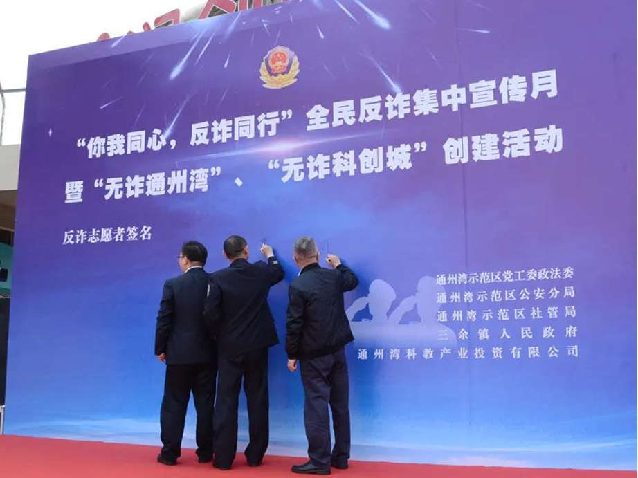 加大宣传,营造氛围。为加大反诈宣传力度,产业公司在教学区、宿舍区多处悬挂反诈横幅标语、放置反诈展板;联合遥望港派出所深入商贸、纵横等院校开展反诈教育,建立科创城反诈联盟,并组建了企业、商业等反诈群;配合示范区举行通州湾“你我同心、反诈同行”集中宣传月暨“无诈通州湾”、“无诈科创城”创建活动,刘书记带领科创城300余名师生参加启动仪式。