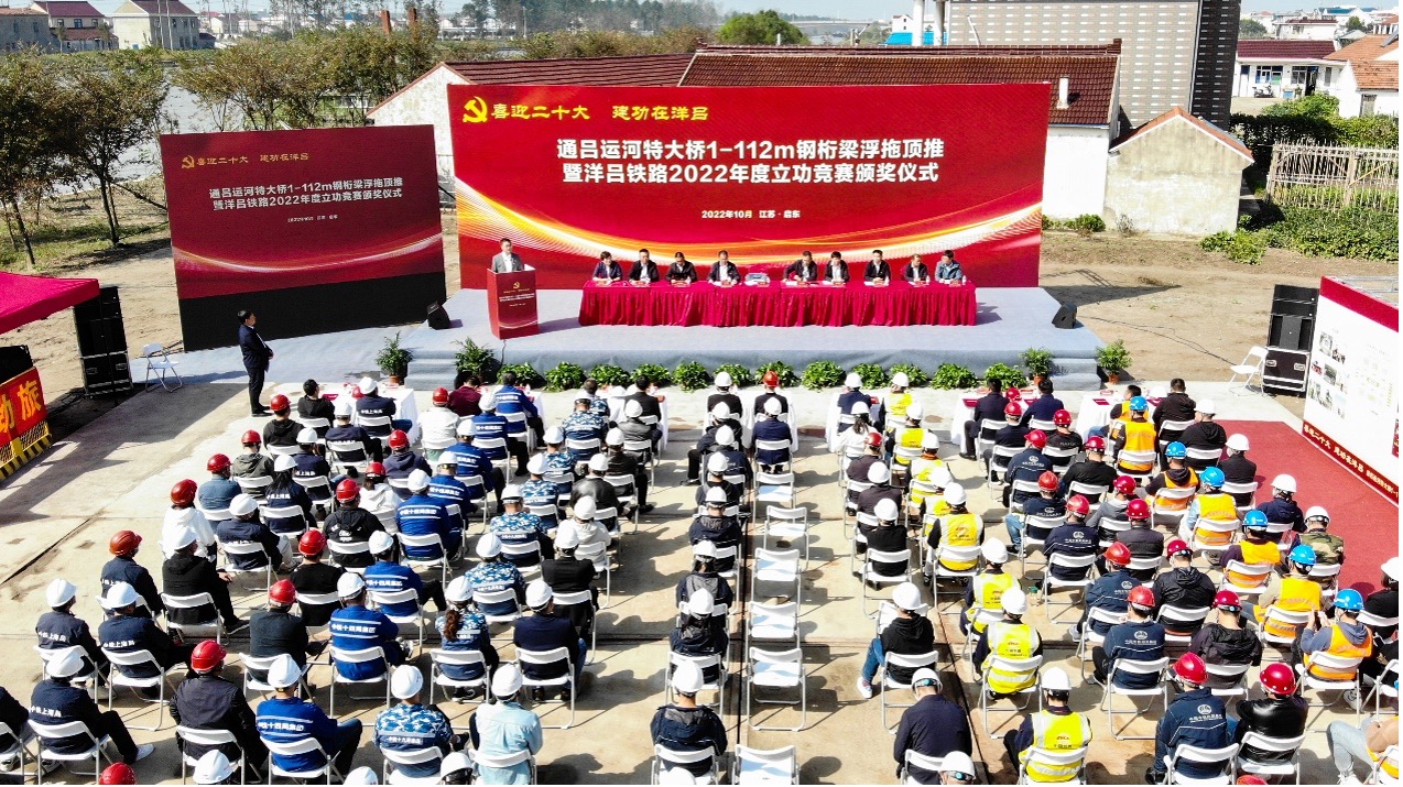 洋吕铁路举办全线首个112m钢桁梁浮托顶推暨洋吕铁路2022年度立功竞赛颁奖仪式